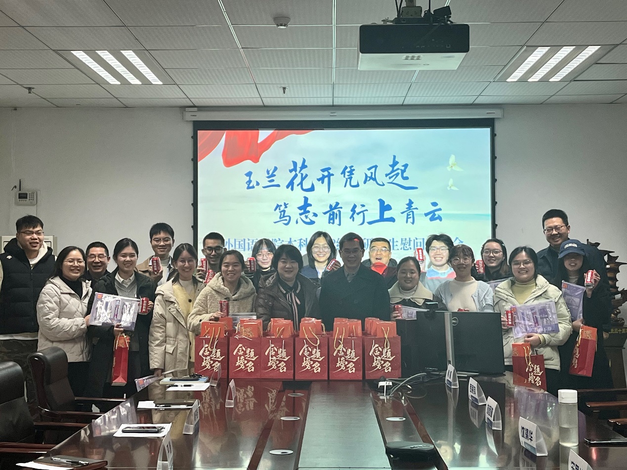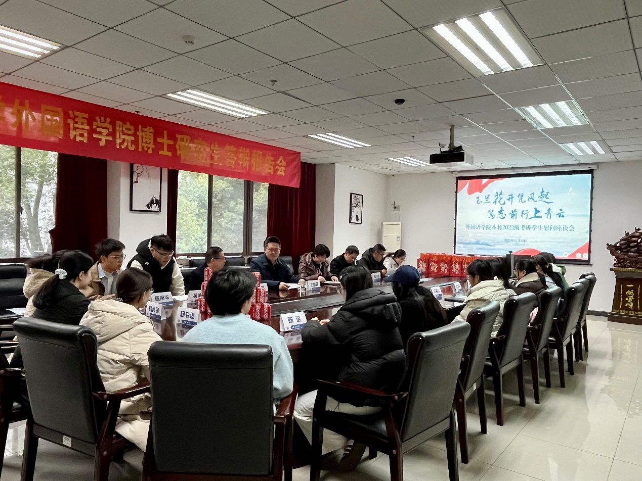 为深入落实立德树人根本任务,精准助力考研学子攻坚克难、逐梦前行,12月15日下午,西南大学外国语学院考研慰问座谈会在学院313会议室召开。学院党委书记严怡,院长、党委副书记肖开容,副院长张俊,班主任代表何武,2022级辅导员黄亦豪、徐莹及考研学生代表参加座谈会。活动由学院党委副书记、纪委书记王新皓主持。