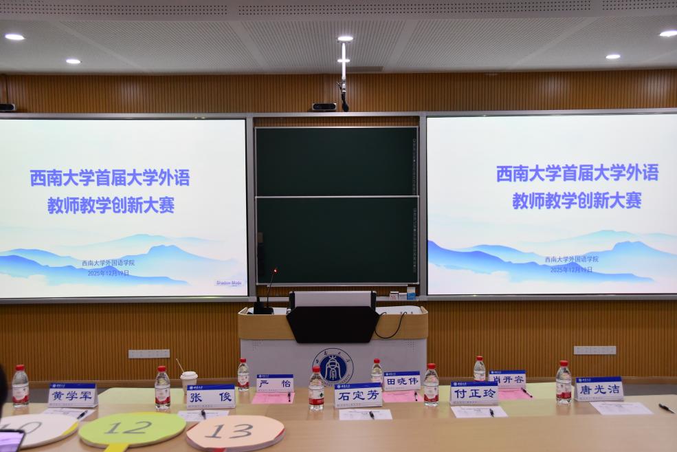 2025年12月19日,西南大学外国语学院成功举办首届大学外语教师教学创新大赛。本次大赛以“技术赋能、思政融入、模式创新”为主题,旨在搭建大学外语教学经验交流平台,促进教学模式创新,助力教师教学能力与育人水平双向提升。来自各教研室的八位教师进行了一场融合前沿教育理念与生动教学实践的专业教学展示。