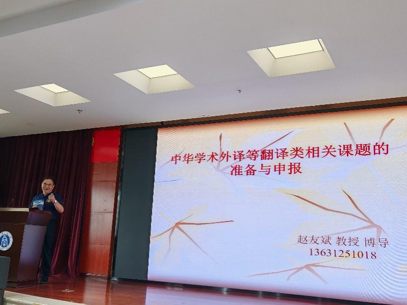 下午3:00,赵友斌教授应学院邀请,作题为“中华学术外译等外语类各项课题的准备与申报”的专题讲座。讲座中,赵友斌教授结合自身的课题申报与评审经验,系统解析了各类国家外语类课题的申报逻辑与核心策略,重点围绕中华学术外译项目展开深入指导。他从已立项项目的学科分布特点、申报的关键环节、团队组建的核心要点出发,详细讲解了如何遴选兼具学术价值、文化价值与国家战略意义的外译著作,明确了选题论证需紧扣“中华”内核,突出学术性,深度融合国家文化传播战略。同时,赵教授特别强调,高质量的翻译样章是课题评审的重要依据,必须做到术语准确规范、文化阐释透彻到位、语言表达流畅自然。整场讲座内容翔实、重点突出、针对性极强,为学院师生提升课题申报能力、规范申报流程提供了清晰的思路与实用的方法,获得了在场师生的一致好评。