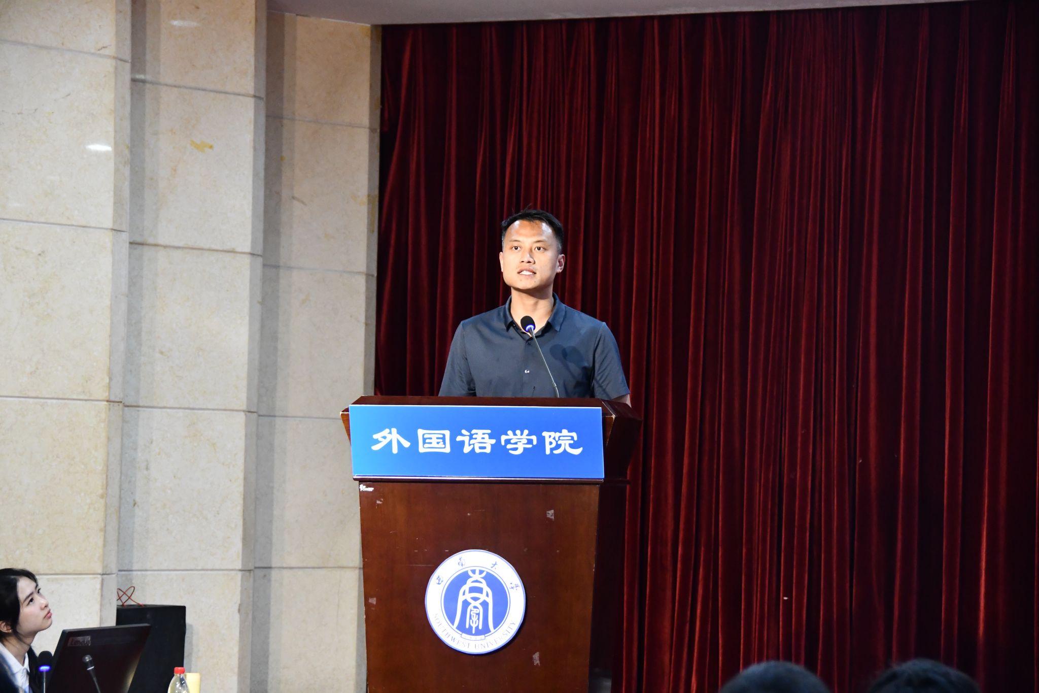 大会由外国语学院党委书记严怡主持。西南大学党委常委、副校长邱江出席大会并讲话。对外联络办公室副主任、校友总会副秘书长冉江渝,学院老领导、离退休教师代表、学院领导班子成员及师生代表参加大会。