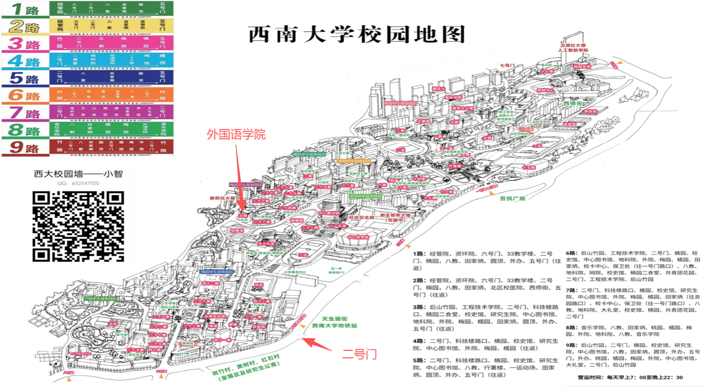 1. 乘坐轨道交通到达北碚时,也可以在西南大学站下车,出站后进西南大学二号门,乘坐校园观光车至外国语学院(五教楼)。