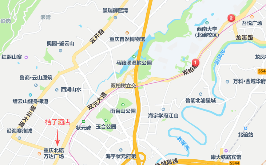 西南大学北碚校区、桔子酒店位置示意图