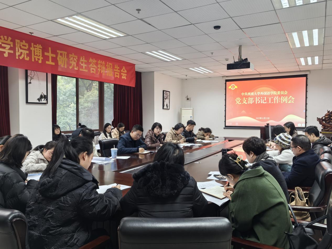 为深入学习贯彻党的二十届四中全会精神,持续夯实基层党建工作基础、提升党支部政治功能和组织功能,学院党委于 2025 年 12 月 15 日下午在 313 会议室召开党支部书记工作例会,系统复盘年度党建工作落实情况,研究部署下一阶段重点任务。会议由学院副处级专职组织员石莹华主持,学院党委书记严怡,党委副书记、纪委书记王新皓以及全体党支部书记、部分支部委员参会。