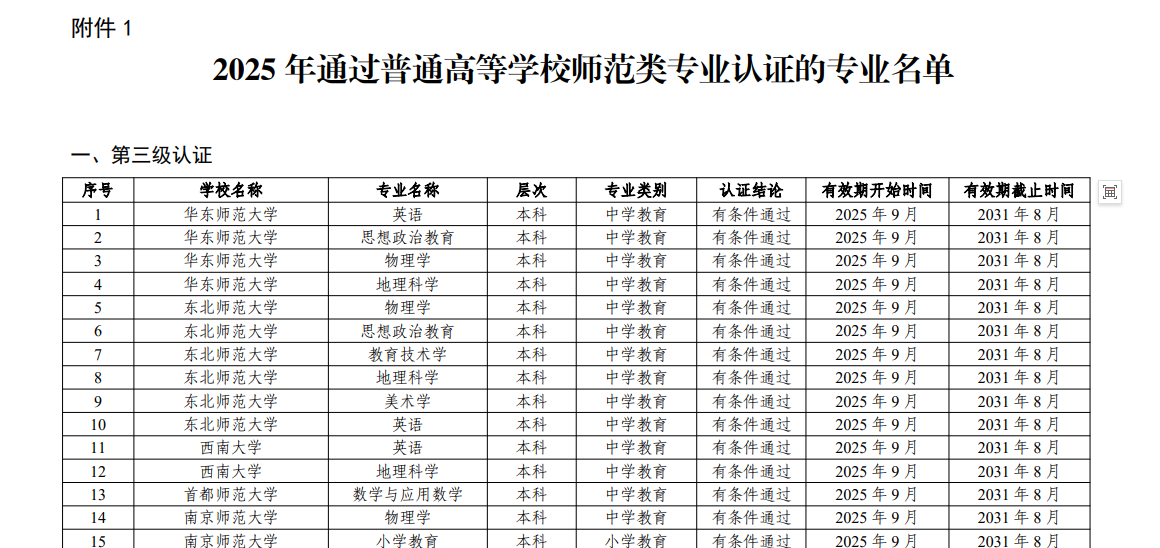 师范类专业认证是国家深化新时代教师教育改革、全面提高师范人才培养质量的核心举措。其中,第三级认证代表国家层面对师范类专业教学质量“卓越”水平的最高认可,旨在引导和激励专业聚焦教育家精神培育、构建卓越教师培养体系。