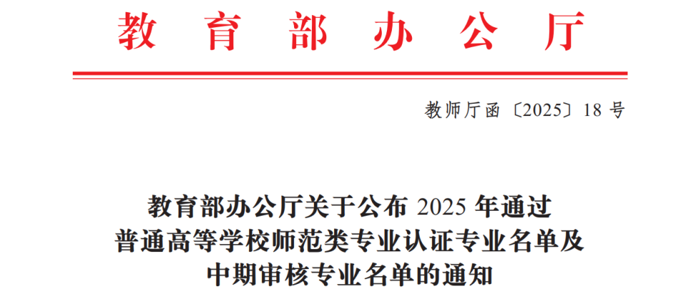 近日,教育部办公厅正式发布了《关于公布2025年通过普通高等学校师范类专业认证专业名单及中期审核专业名单的通知》(教师厅函〔2025〕18号)。学院英语专业顺利通过了中学教育第三级认证,认证有效期六年。